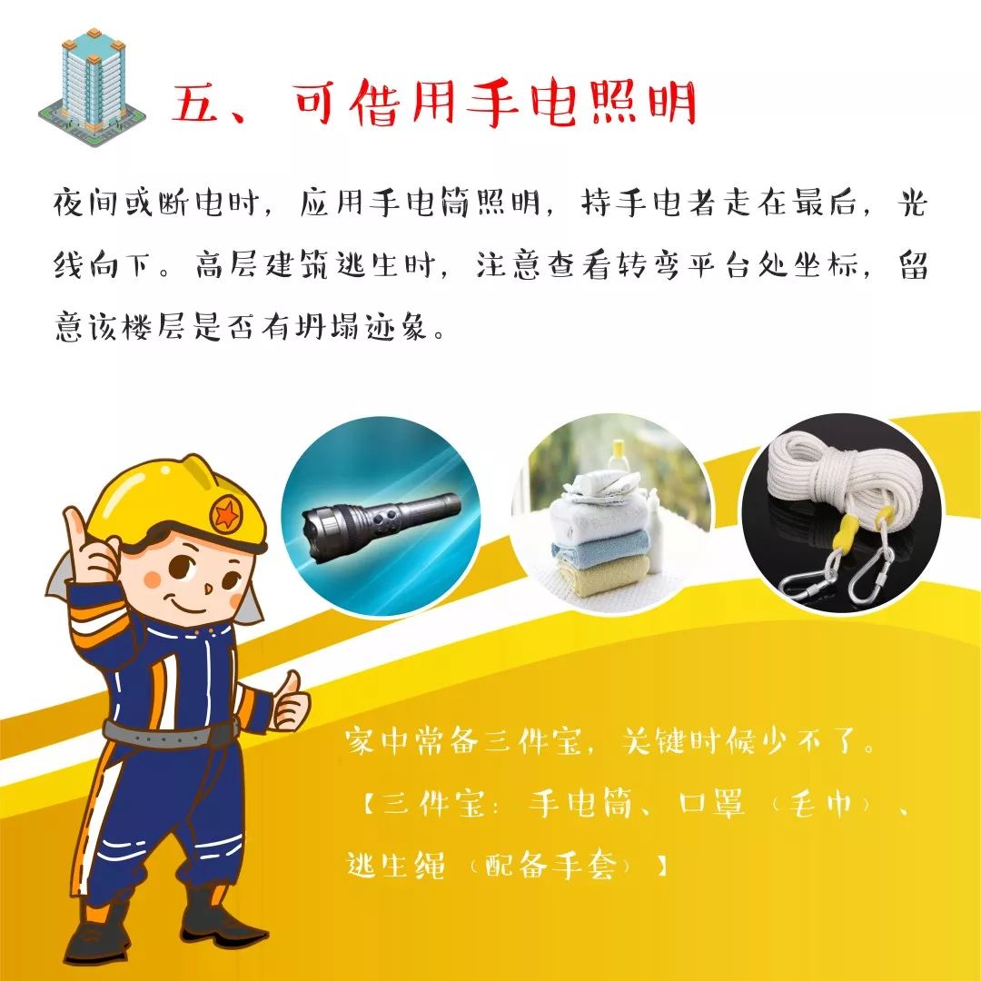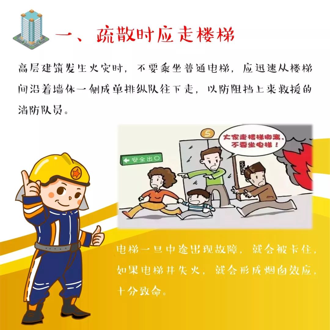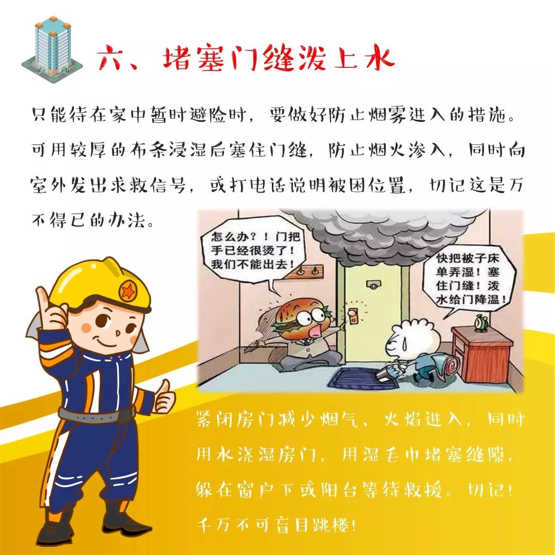 浓烟关门:如果发现有浓烟从楼下冒上来,表示下方发生火灾,是一个比较危险的环境。当评估不能安全穿越时,我们应该选择在目前的楼层关门避难,而不是往上或往下跑。切记,关上房门,用湿毛巾封堵门缝,迅速拨打119等待救援!