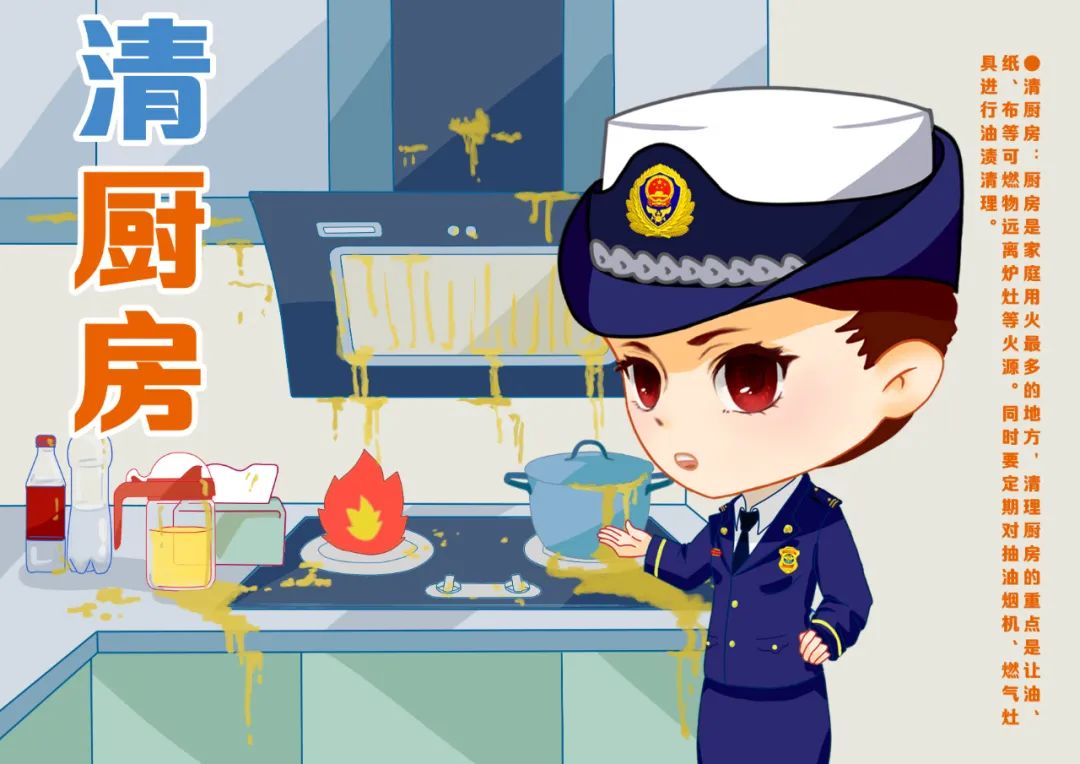 厨房是家庭用火最多的地方,清理厨房的重点是让油、纸、布等易燃物、可燃物远离炉灶等火源。同时也要定时对抽油烟机、燃气灶具进行清理,杜绝火苗引燃油污发生火灾的可能。