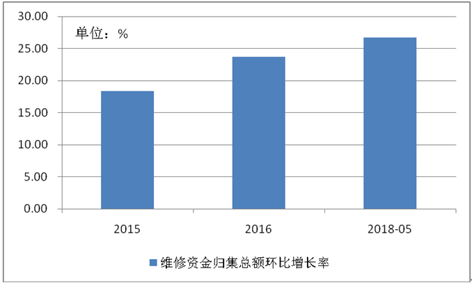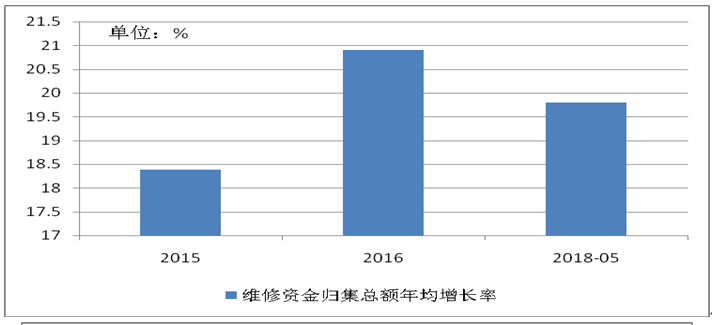 (五)维修资金情况 2000年,我省维修资金制度建立并开始起步,之后国家层面《物权法》和《物业管理条例》的出台,助推了全省维修资金制度建设速度,目前全省已有21个市(县)建立了维修资金制度,占全省总数的75%。截至目前,全省累计归集维修资金达367.16亿元,较2014年的197.99亿元,增长了169.17亿元,年均增长率为19.79%。全省共实现维修资金增值收益(利息)收入24.68亿元,较2014年的12.06亿元,增长了12.62亿元,总体呈现稳步增长的态势(图5)。 ![]()