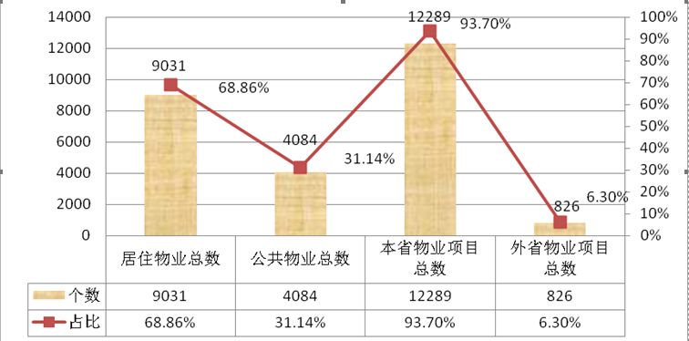 一 河南省物业管理行业发展基本概况 (一)企业发展情况 截止2017年年底,全省从事物业服务的企业总数达7000余家,受资质取消影响,全年在工商登记部门登记从事物业服务的企业近800家,从业门槛降低效益凸显。企业之间的兼并、整合、合作数量明显增加,市场活跃度不断提升,规模企业数量较往年增加明显。 经统计,截止2017年,物业服务企业共计在管13115个服务项目,其中居住物业项目9031个,占比68.9%,公共物业项目4084个,占比31.1%;本省市物业项目12289个,占比93.7%,外省市物业项目826个,占比6.3%(图1)。调查显示,河南省物业服务企业在省外接管项目较2016年增加近100个,河南物业服务企业跨省市服务能力进一步增强。