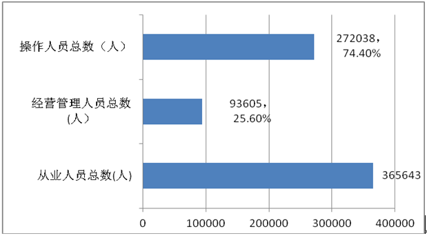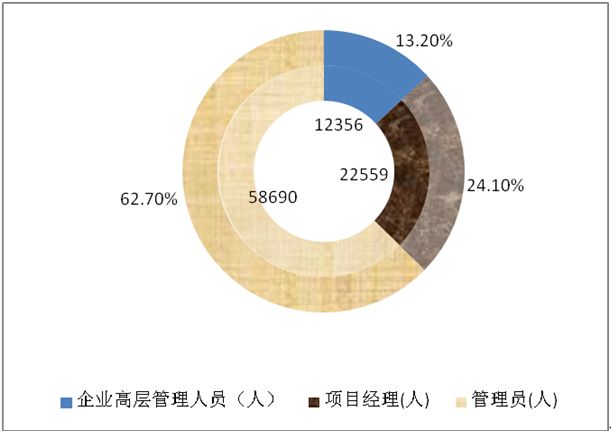 (二)从业人员情况 据统计,截止2017年全省共有物业从业人员36万余人,其中经营管理人员93605人,占比25.6%,各类操作人员272038人,占比74.4%。在行业从业人员中,基层操作人员占比超过了70%,与行业发展要求和企业经营管理要求基本相符(图2)。在管理人员中,高层管理人员、项目经理人员与普通管理人员之比为1:1.83:4.75,整体结构更趋合理(图3)。