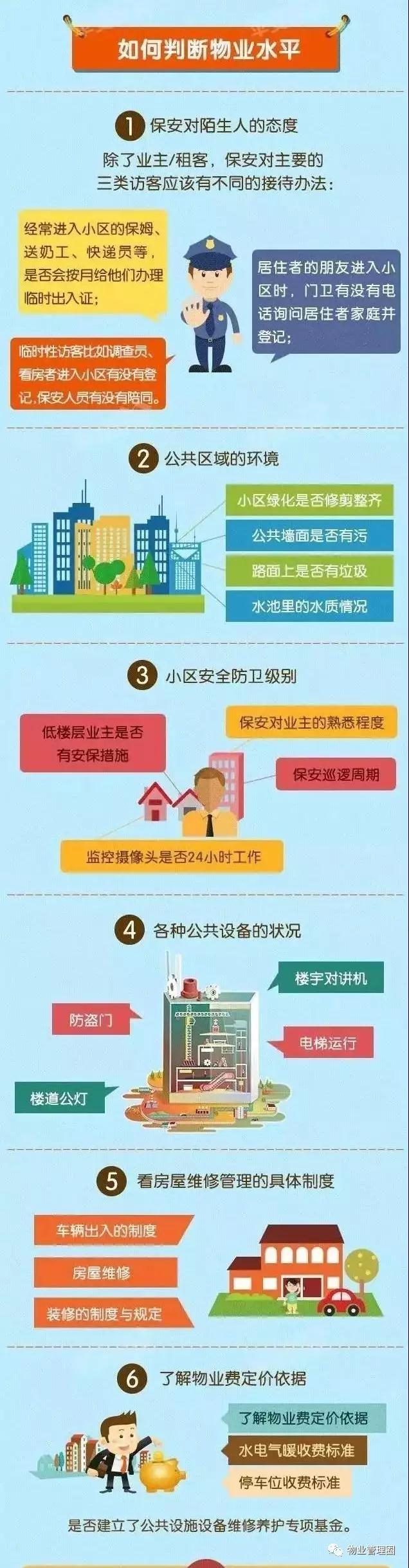 8、建立物业档案,方便服务于住户,物业档案包括物业设计施工图、物业产权档案、住户档案、电子信息档案等。对所收集的档案进行全面、规范、科学、准确的管理,特别是地上地下各类管网、线路、管道,各类隐蔽项目,主要构件及其设备,这些关键档案的管理至关重要,好像一个人“血管”系统分布,将会长期为我们全体住户提供一个全面安全舒适居住环境。 02 如何判断物业的好坏?