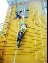 楼层低的利用窗户逃生。在火场受困时,大多数人可采用这个办法。前提条件是火势不大,没有蔓延到整个单元住宅,同时较熟悉室内情况,具体做法是:将绳索(无绳索可用床单或窗帘撕成布条)一端系于窗户横框(或室内其他固定构件)上,另一端系于小孩或老人的两腋和腹部,将其沿窗放至地面或下层窗口,破窗入室从通道疏散,其他人可沿绳索滑下。注意:三层楼以上不建议用此方法逃生。
