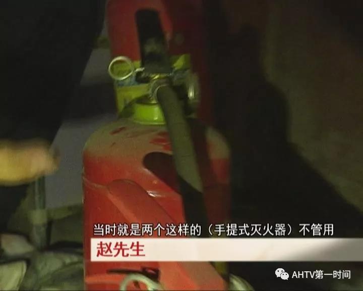之后,赵先生又取出消防柜里的手提式干粉灭火器进行灭火。然而,灭火器显示红色没有气压,也不能用。