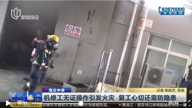 4月1日,金山区山宁路上一家刚复工不久的企业的生产车间发生火灾,所幸企业开展自救加上报警及时,火灾被迅速扑灭,未造成人员伤亡。4月6日消防部门出具火灾调查结果,查明系厂内机修工违规动火引发,目前该机修工被处以行政拘留。