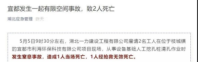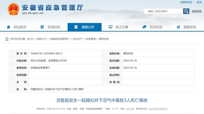 5月30日7时30分许,湖北省航道工程有限公司(国企)所属岳罗河劳务队(湖北海鑫达劳务有限公司)在灵璧县灵城镇实施倒虹吸井作业时,1名工人进入井内模板拆除施工时晕厥,之后2名工人自发下井抢救时也发生晕厥情况,3人均重度昏迷。送医抢救无效后,3人于12时前先后死亡,初步判断为井下沼气中毒导致。