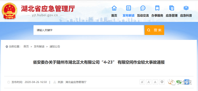 2020年4月23日15时许,湖北省随州市高新区湖北正大有限公司在组织对污水沟进行清淤作业时发生事故,导致3人死亡。具体事故原因正在进一步调查中。该起事故暴露出企业安全生产主体责任意识不强、有限空间作业等安全管理规定不落实、安全教育培训不到位、事故应急救援处置不力等突出问题。