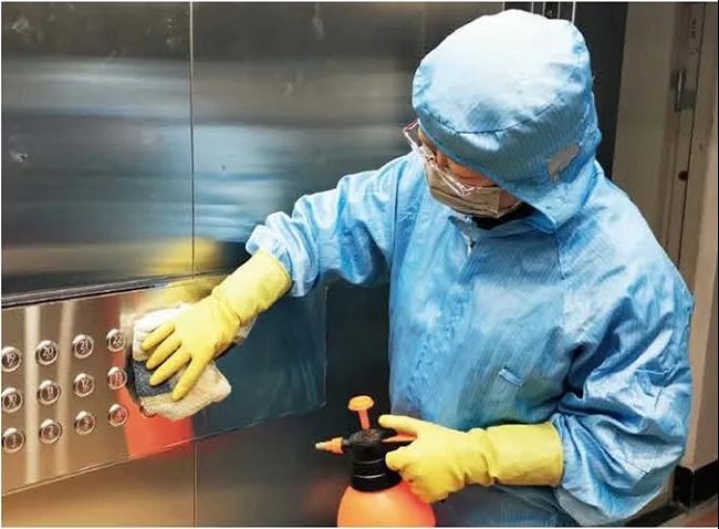 保洁人员为电梯消毒