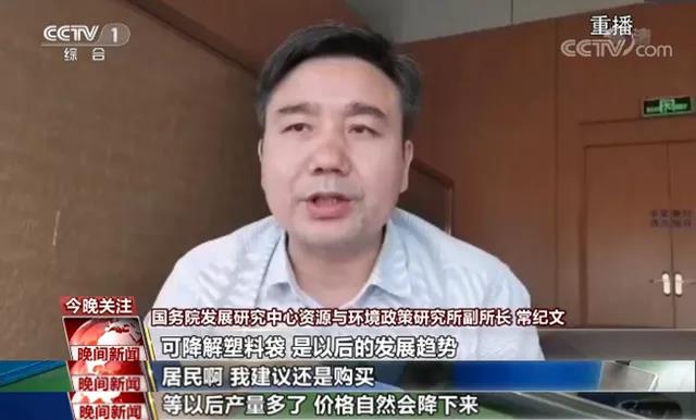 国务院发展研究中心资源与环境政策研究所副所长 常纪文:可降解塑料袋是以后的发展趋势,我建议还是购买。以后产量多了,价格自然会降下来。可降解塑料袋不是说在任何条件下都是可以降解的,它的降解是有特定的条件。那么现在有一个管理上的难处,就是可降解塑料袋和我们一般使用的塑料袋,如果混在一起,都进了垃圾焚烧发电厂了,那么可降解塑料袋要发挥作用是很难的。