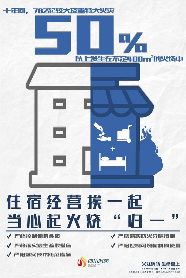 警示案例 2014年3月36日,广东省揭阳市普宁市军埠镇一家庭作坊发生火灾,过火面积约208平方米,15人不同程度受伤送医院救治,其中11人因窒息抢救无效死亡。 2014年12月15日,河南省新乡市长垣县一歌厅发生火灾,过火面积123平方米,造成12人死亡,28人受伤,直接财产损失12.9万元。起火原因为电热器烤爆空气清新剂所致,遇难者死亡原因系吸入浓烟窒息而死。 2015年7月11日,湖北省武汉市一小区电缆井发生火灾,造成7人死亡,12人受伤。遇难者死亡原因系吸入大量浓烟和电缆燃烧产生的有毒气体。 2016年2月15日,吉林省四平市梨树县郭家店镇一洗浴中心发生火灾,过火面积367平方米,造成5人死亡,直接财产损失约500万元。起火原因为汗蒸房北侧墙面西北侧碳纤维发热电缆长时间工作产生局部热聚集,烤燃周边竹帘所致,5名遇难者均为窒息死亡。 消防安全,人人有责 吴京、赵丽颖化身“火焰蓝” 这些安全提示,请记牢!