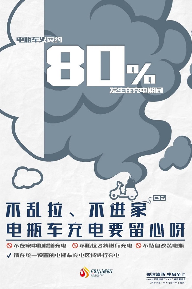 警示案例 2015年3月17日,上海市浦东新区东集路200号一物流配送中心发生火灾,过火面积约9000平方米,直接财产损失4556.6万元。起火原因为电气线路短路所致。 2017年12月30日,江西省赣州市南康区唐江镇一出租屋发生火灾,过火面积约400平方米,造成5人死亡,直接财产损失约300万元。起火原因为电气线路短路引燃周边可燃物。 2018年8月25日,黑龙江省哈尔滨市松北区一酒店发生重大火灾事故,过火面积约400平方米,造成20人死亡,23人受伤,直接财产损失2504余万元。起火原因为顶棚悬挂的风机盘管机组电气线路短路,形成高温电弧,引燃周围塑料绿植装饰材料并蔓延成灾。 2019年6月11日,云南省大理镇银苍社区叶榆路一民房发生火灾,过火面积约230平方米,造成6人死亡,直接财产损失34万元。起火原因为货架底部旁的锂电池在充电过程中短路起火,引燃周围可燃物。 03电瓶车火灾 数说安全 调查发现,近年来多数电瓶车火灾事故均发生在充电过程。数据显示,全国电瓶车火灾案例,约80%发生在充电过程,而亡人火灾几乎全部发生在充电时段。