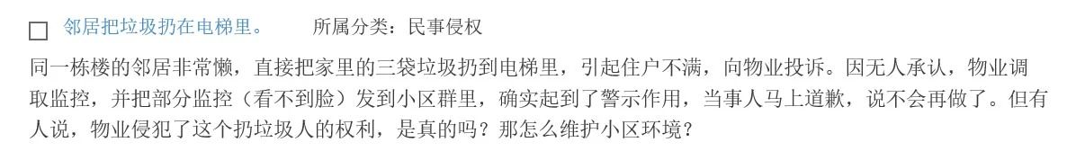 “每天出门就看见电梯里留着新鲜的垃圾,到底是谁干的?没人承认还能不能愉快地做邻居了……”以下咨询由李琳律师解答