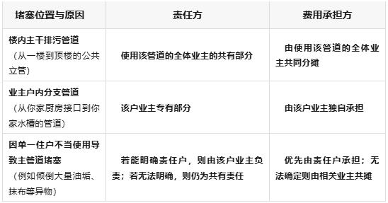 因为这根管道是楼上楼下所有住户共用的,每一户的生活污水都通过它排出。堵塞是由于长期使用和共同排放造成的,并非某一户的单独行为(除非有证据证明),因此维护责任和费用自然也应由所有使用者共同承担。这符合“谁受益,谁负担”的原则。