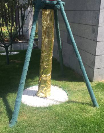 乔木支撑架使用绿色无纺布缠绕,美观大方。